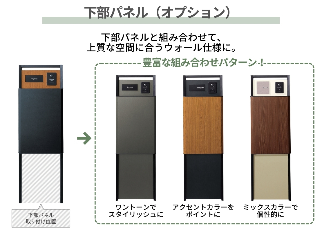 下部パネル 仕様 | 材質:高耐食溶融めっき鋼板(前面/シート仕上げ・背面/塗装仕上げ) |