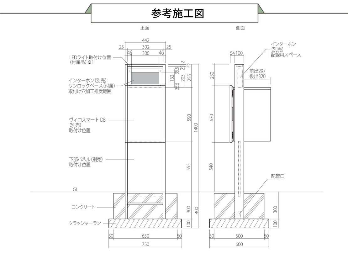 ヴィコスマートDBをサイン・インターホンと一体で設置できる門柱スタンドです。機能を一か所にまとめられるため、外構全体がすっきりとした印象に仕上がります。アルミブラックのフレームとパネルの組み合わせで、住宅外観に自然になじみつつ上質感をプラス。新築時の計画はもちろん、後付けで門柱を整えたいケースにも使いやすい構成です。