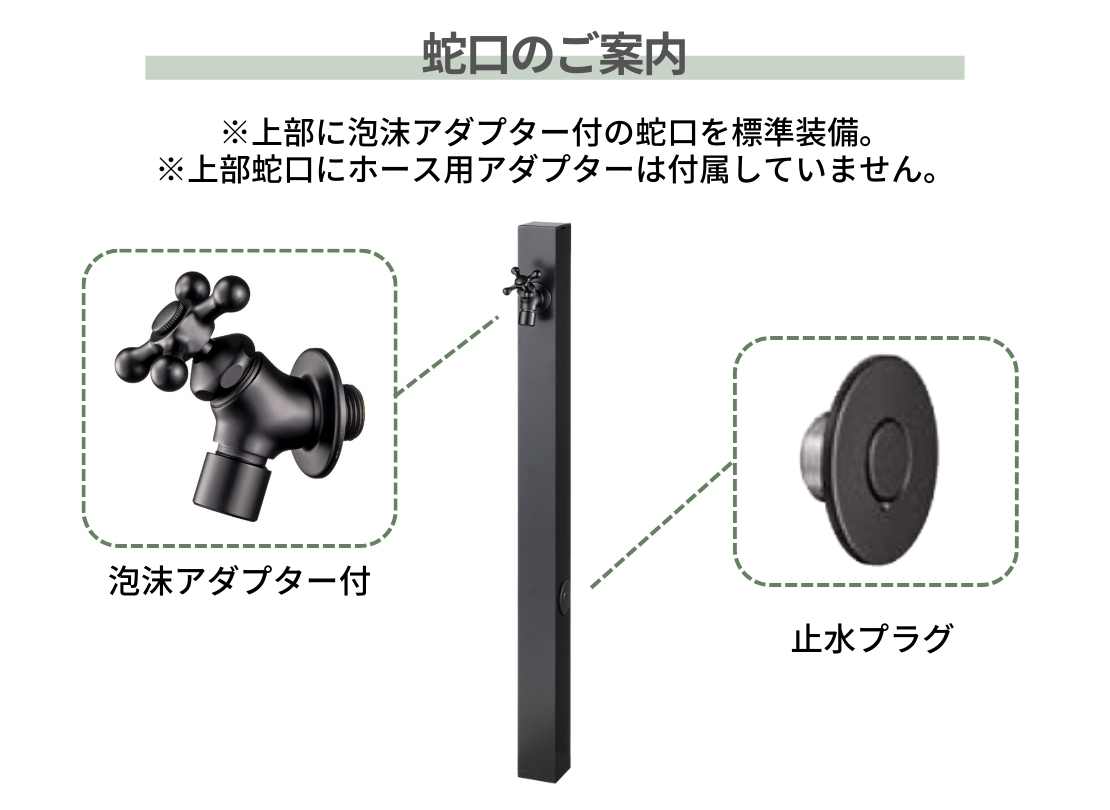 付属品 | 上部蛇口(泡沫アダプター付)、止水プラグ |