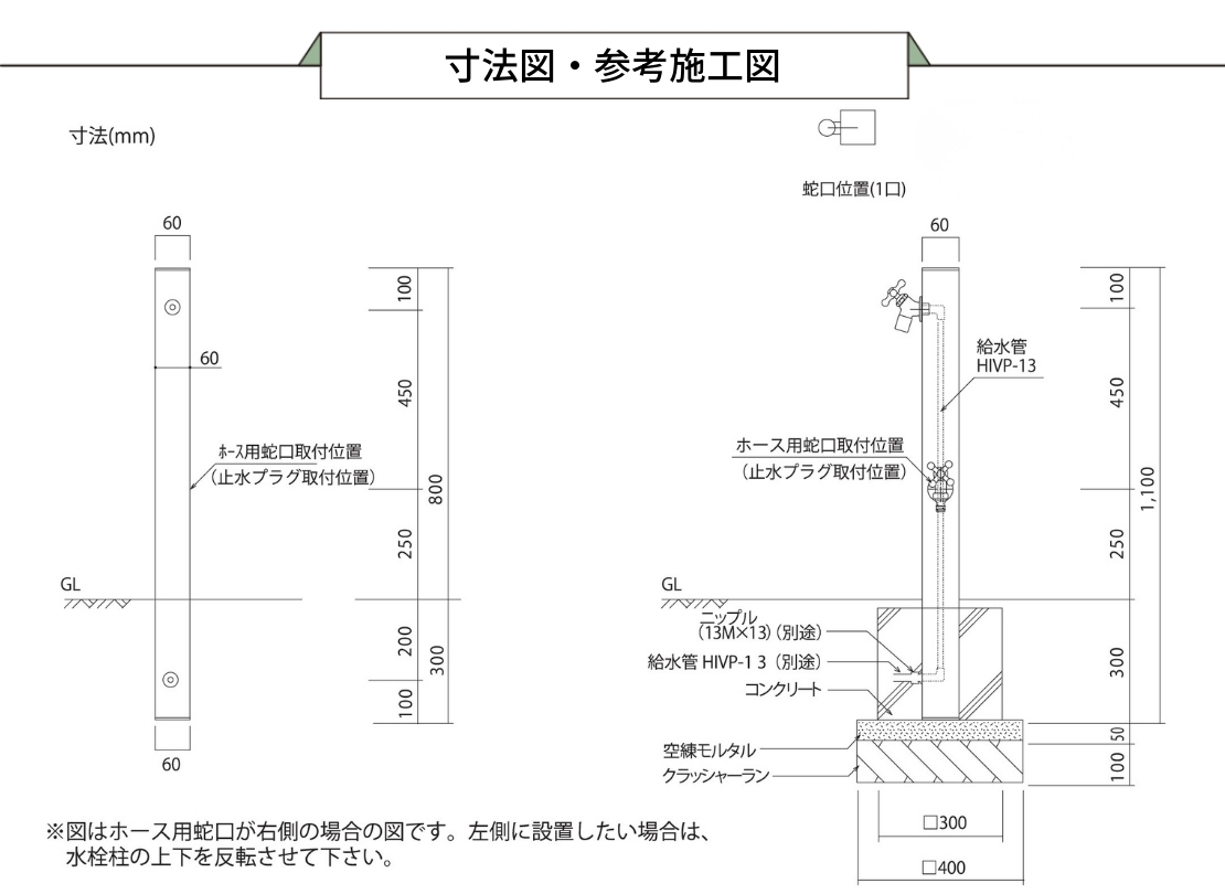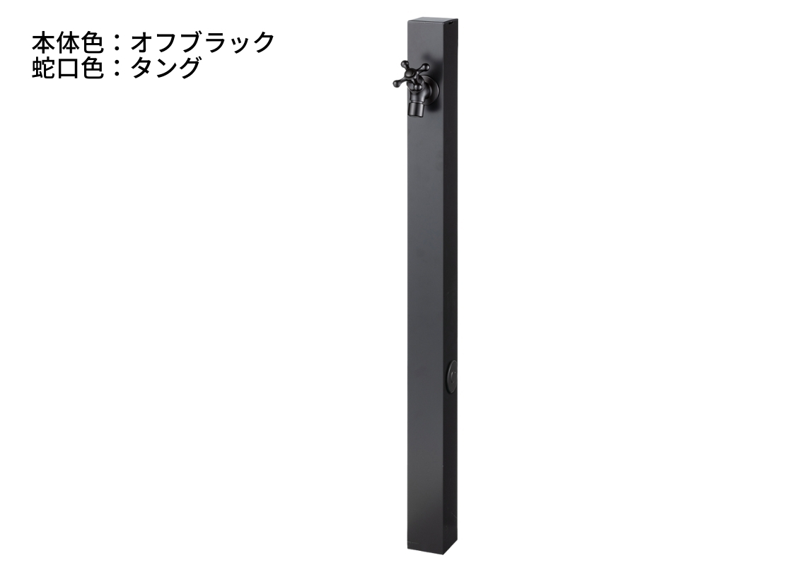 オールブラックでまとめた、シャープな印象の立水栓です。1口仕様のため、使用しない側は付属の止水プラグでスマートに仕上げられるのがポイント。左右どちら向きにも設置でき、敷地条件や動線に合わせて柔軟に対応できます。装飾を抑えたシンプルな外構や、モダン住宅の足元をすっきり見せたい方におすすめです。