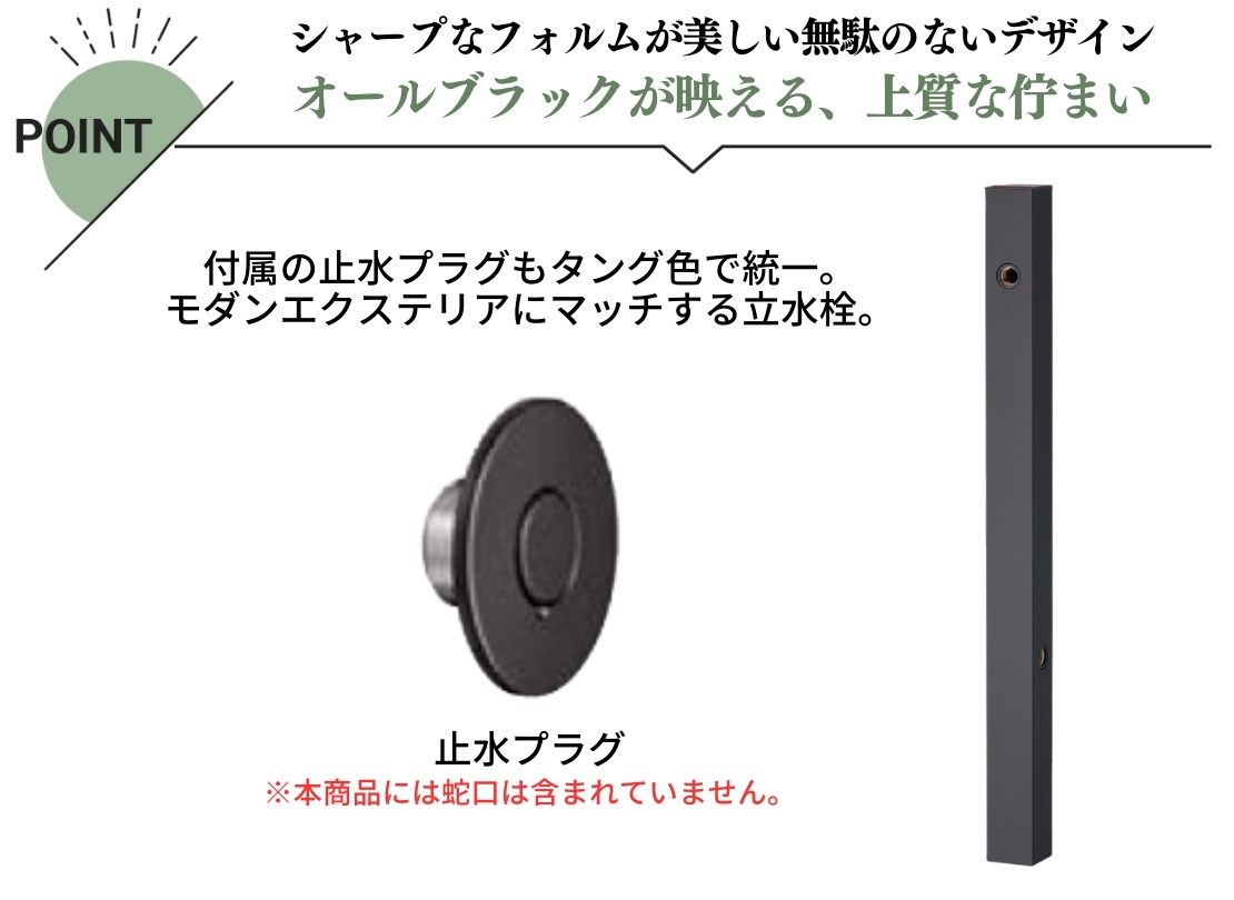 オールブラックでまとめた、直線的で無駄のないデザインが魅力の立水栓です。蛇口は付属せず、お好みのデザインや使い勝手に合わせて自由に組み合わせられる仕様。使用しない側は付属の止水プラグでスマートに仕上げられます。上下を反転させることで左右どちら向きにも対応でき、モダン外構をすっきりと引き締めてくれます。