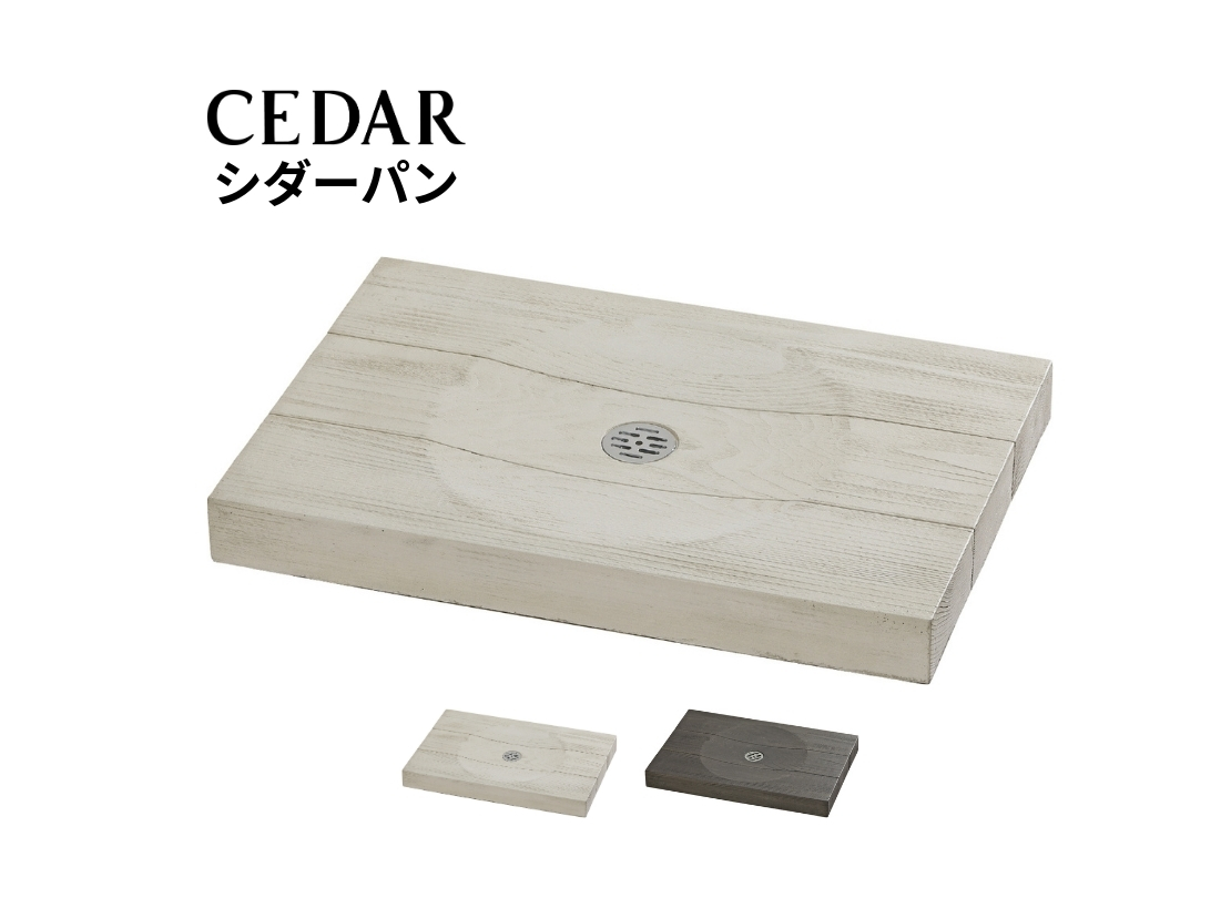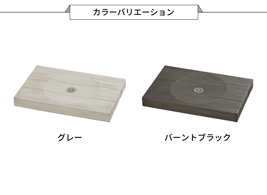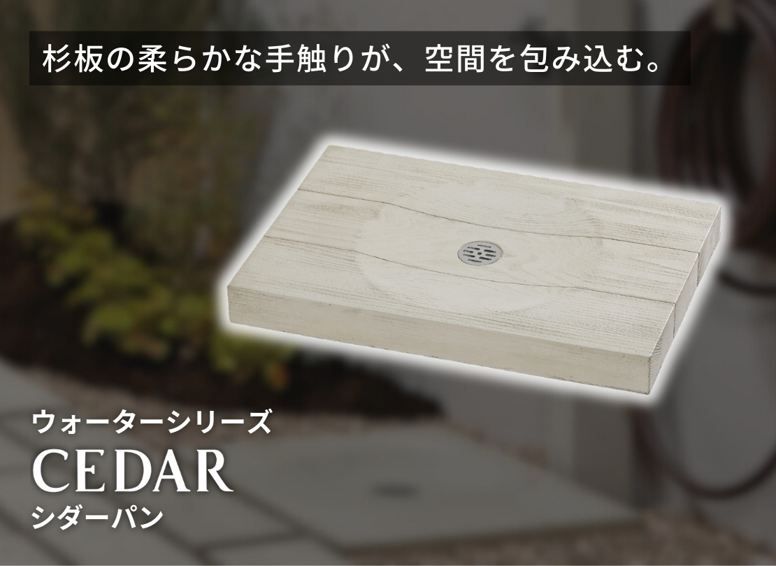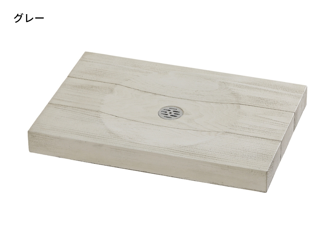 杉板のやわらかな表情を再現したデザインで、立水栓まわりをさりげなく上質に見せてくれるパンです。木そのものではないため、気を使いすぎず日常使いできる点が特徴。ナチュラル外構や和モダンの足元に合わせやすく、コンクリート仕上げに素材感をプラスしたい場合の選択肢として使いやすい一枚です。