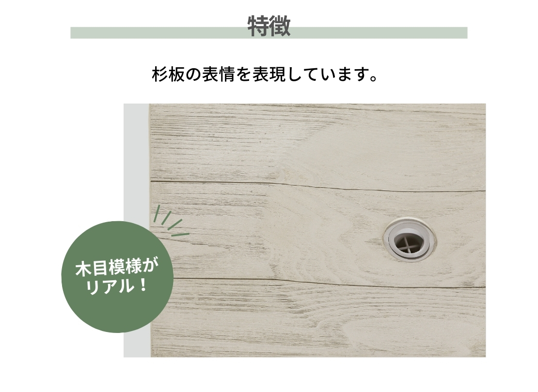 使い込むほどに美しさが深まる杉板の表情を再現。さりげなくても素材感のある佇まいの中に、木目調の表情が浮き上がり、あたたかな1日の流れの中のアクセントになります。