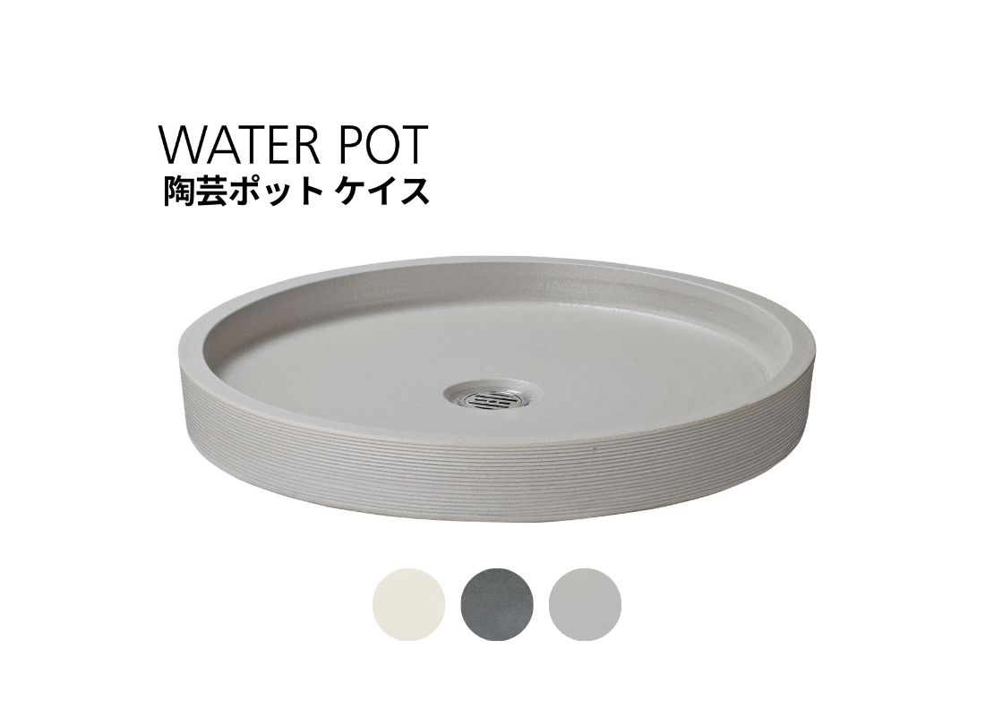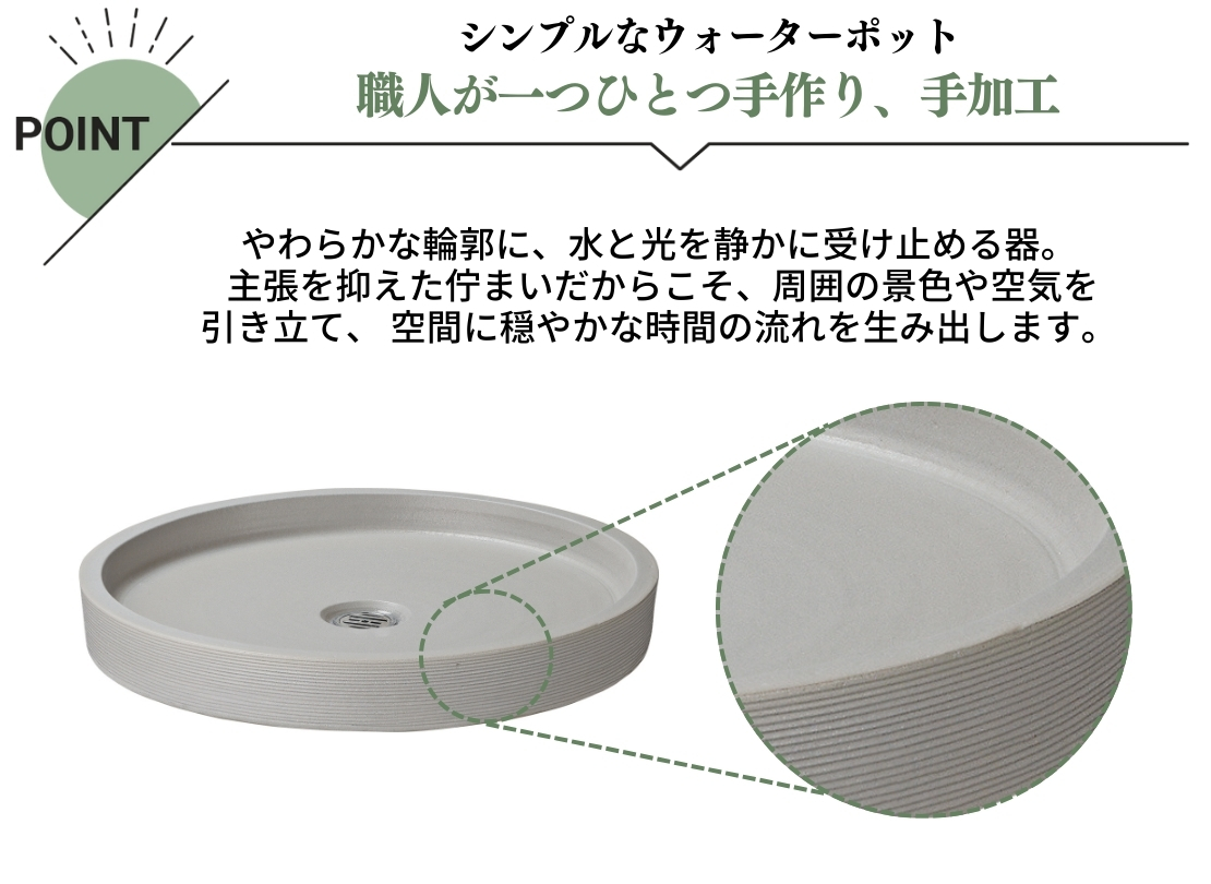 主張を抑えたフラットな形状と、信楽焼ならではのやわらかな質感が特長のウォーターポットです。植栽や石材の邪魔をせず、空間全体を静かに整えたい外構に向いています。目皿・ゴム栓付きで排水処理もしやすく、水鉢としても景石まわりの演出としても使いやすい一品です。