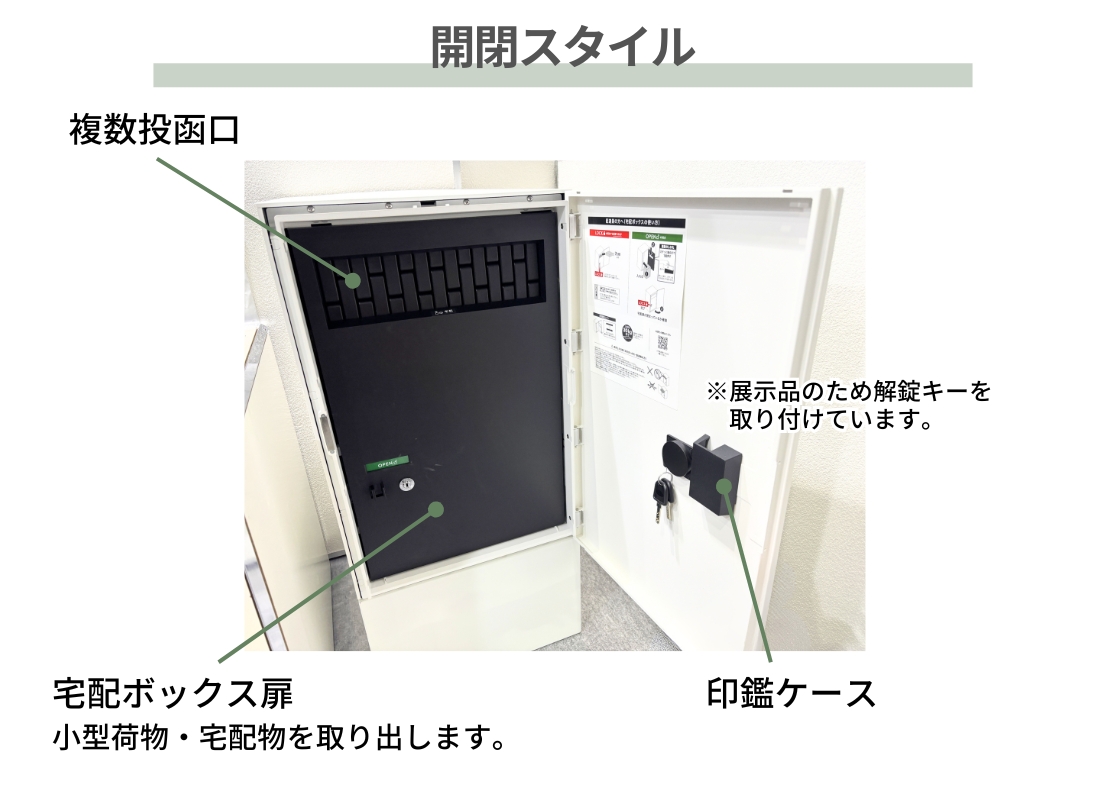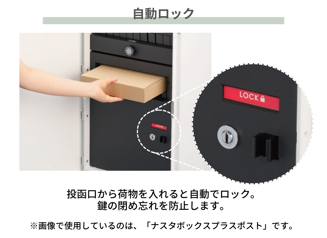 「Nasta Box +POST(ナスタボックス プラスポスト)」のシリーズで、郵便ポストがついていない、複数受け取り可能な宅配ボックスのみの機能のものです。ポストがない分、宅配ボックスの受け取り可能サイズが縦に12cmほど広い仕様となっています。