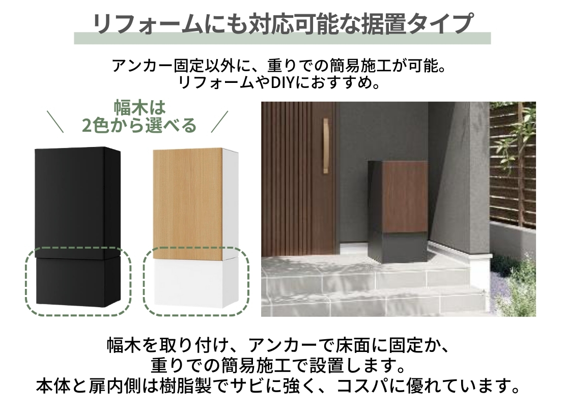 不在が多いご家庭には、複数回受け取りできる安心感がいちばんの魅力。ナスタ ボックス プラスは自動ロック機能を備え、厚さ7cmまでの小型荷物も重ねて受け取れます。DIYにも対応した幅木セットなので、アンカー固定はもちろん重り施工でも設置可能。色も選べて玄関に自然になじみ、ポスト機能が不要で宅配専用でしっかり受け取りたい方におすすめです。