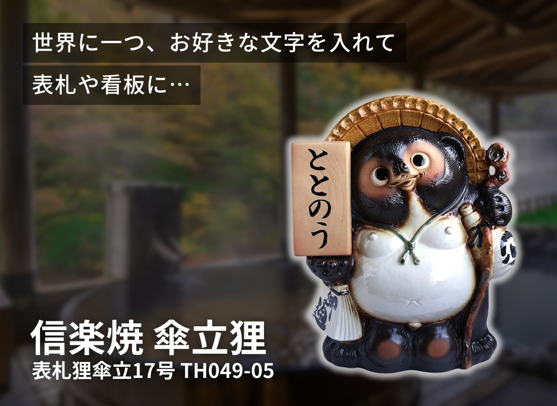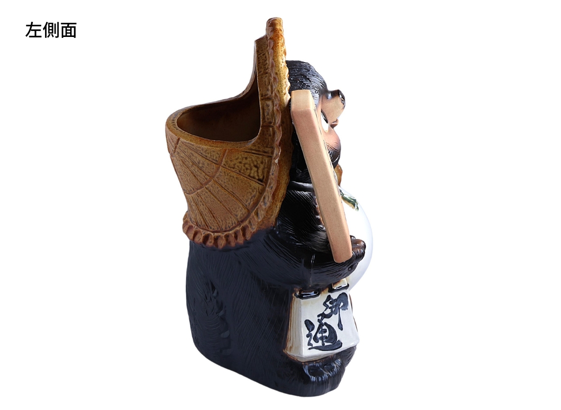 信楽焼ならではの素朴な風合いと、愛嬌のあるたぬきの表情が、玄関先や店先をやさしく和ませてくれる置物です。表札としての役割に加え、傘立てとしても使える実用性がポイント。来客時のちょっとした話題づくりにもなり、個人宅はもちろん、店舗や施設の“顔”としてもおすすめです。