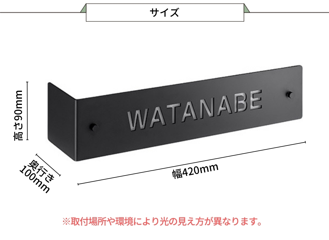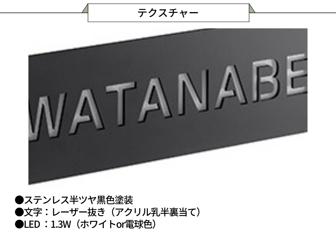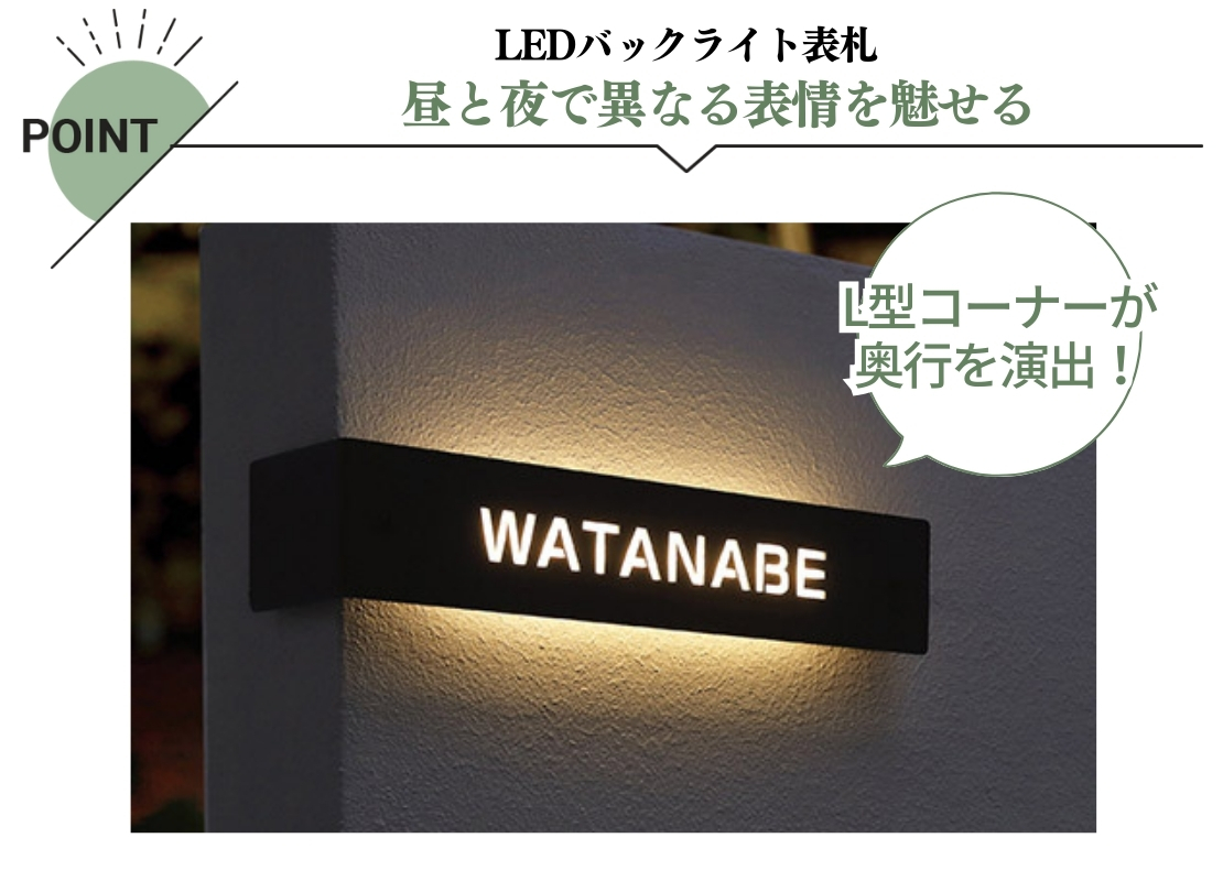 門柱や壁のコーナーを活かしたい方におすすめのLEDバックライト表札です。L型形状ならではの奥行き感が生まれ、昼間はシンプルに、夜はやわらかな光で上質な印象を演出できます。光色は電球色・ホワイトから選択可能で、外構全体の雰囲気に合わせやすいのもポイント。角への設置を前提に、デザイン性と視認性を両立した一枚です。