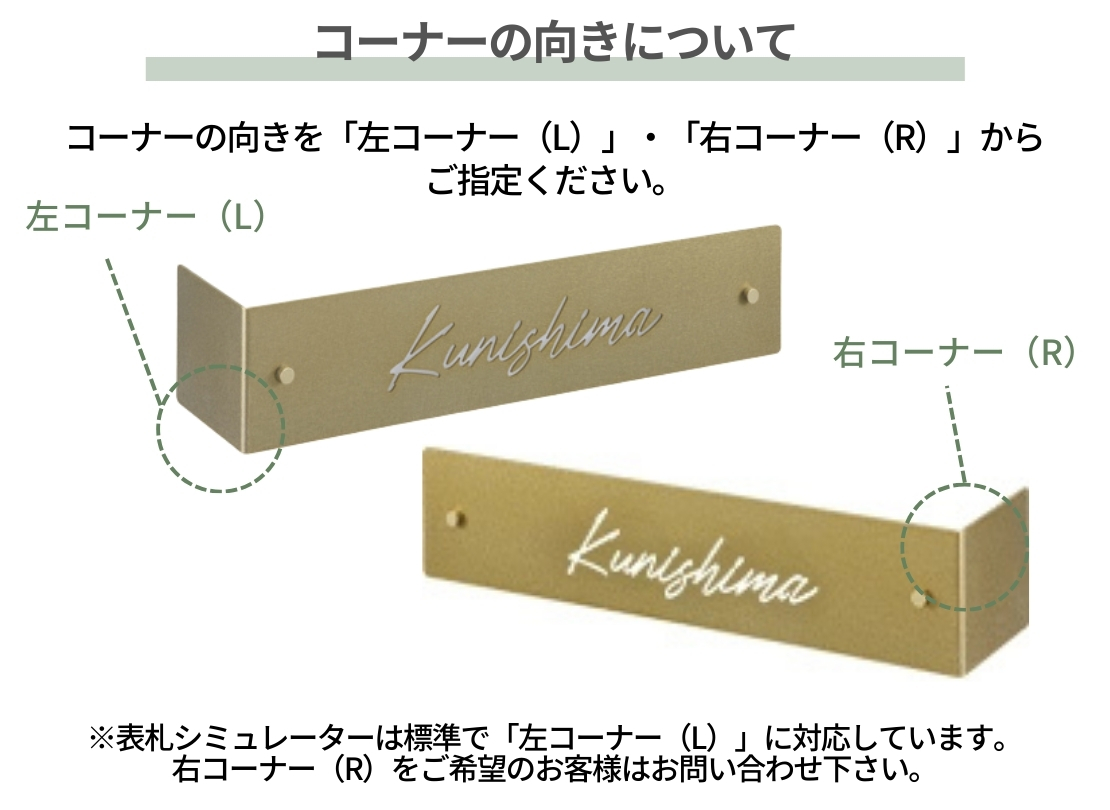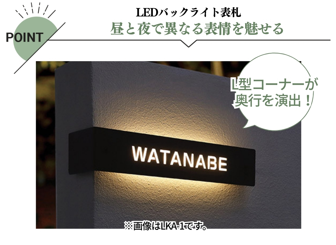 門柱や壁のコーナーを活かしたい方におすすめのLEDバックライト表札です。L型形状ならではの奥行き感が生まれ、昼間はシンプルに、夜はやわらかな光で上質な印象を演出できます。光色は電球色・ホワイトから選択可能で、外構全体の雰囲気に合わせやすいのもポイント。角への設置を前提に、デザイン性と視認性を両立した一枚です。