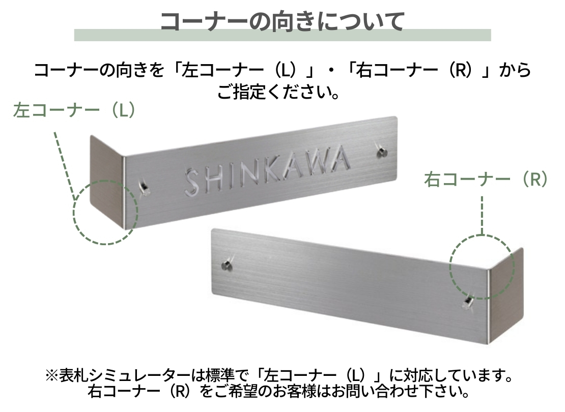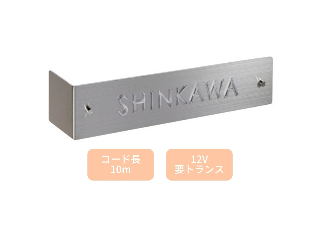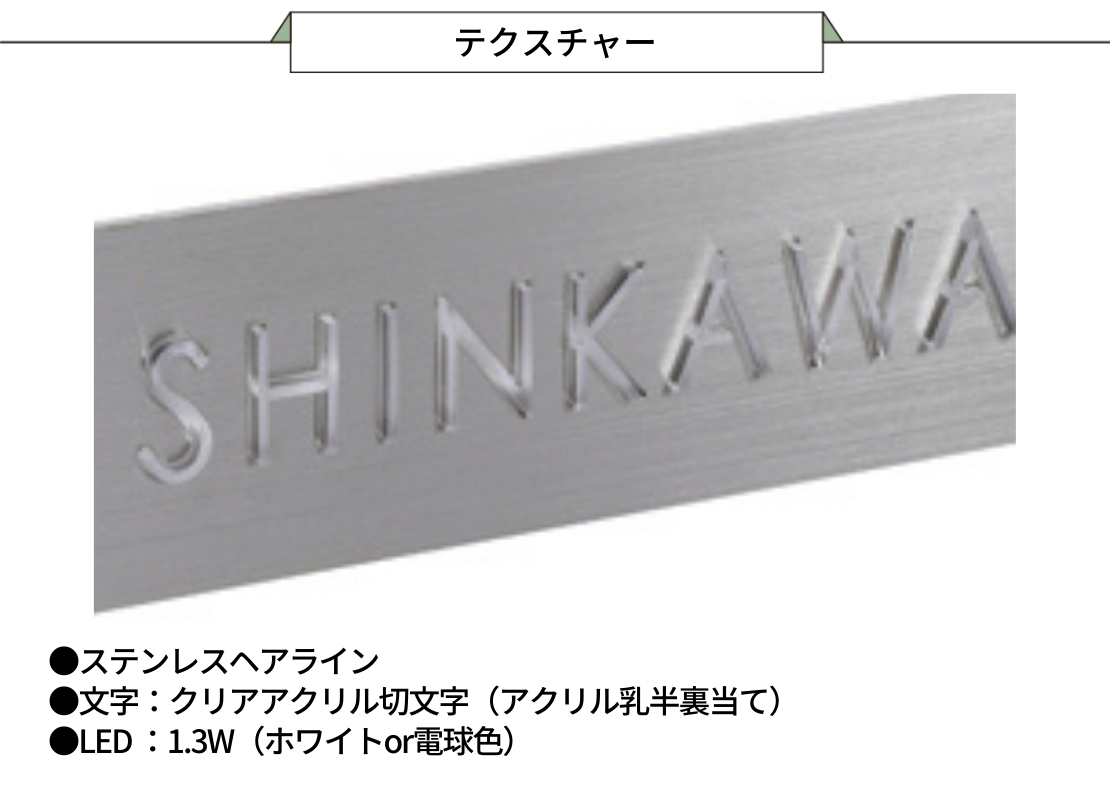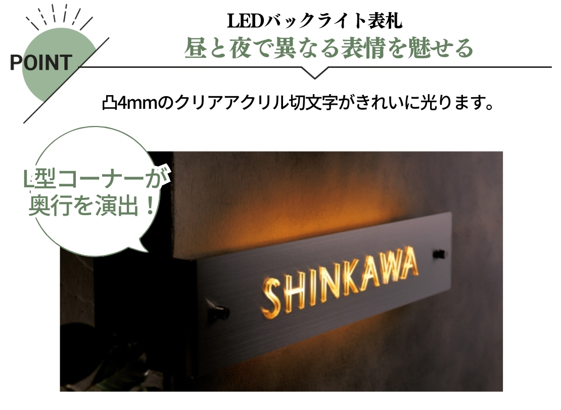 門柱や壁のコーナーを活かしたい方におすすめのLEDバックライト表札です。L型形状ならではの奥行き感が生まれ、昼間はシンプルに、夜はやわらかな光で上質な印象を演出できます。光色は電球色・ホワイトから選択可能で、外構全体の雰囲気に合わせやすいのもポイント。角への設置を前提に、デザイン性と視認性を両立した一枚です。