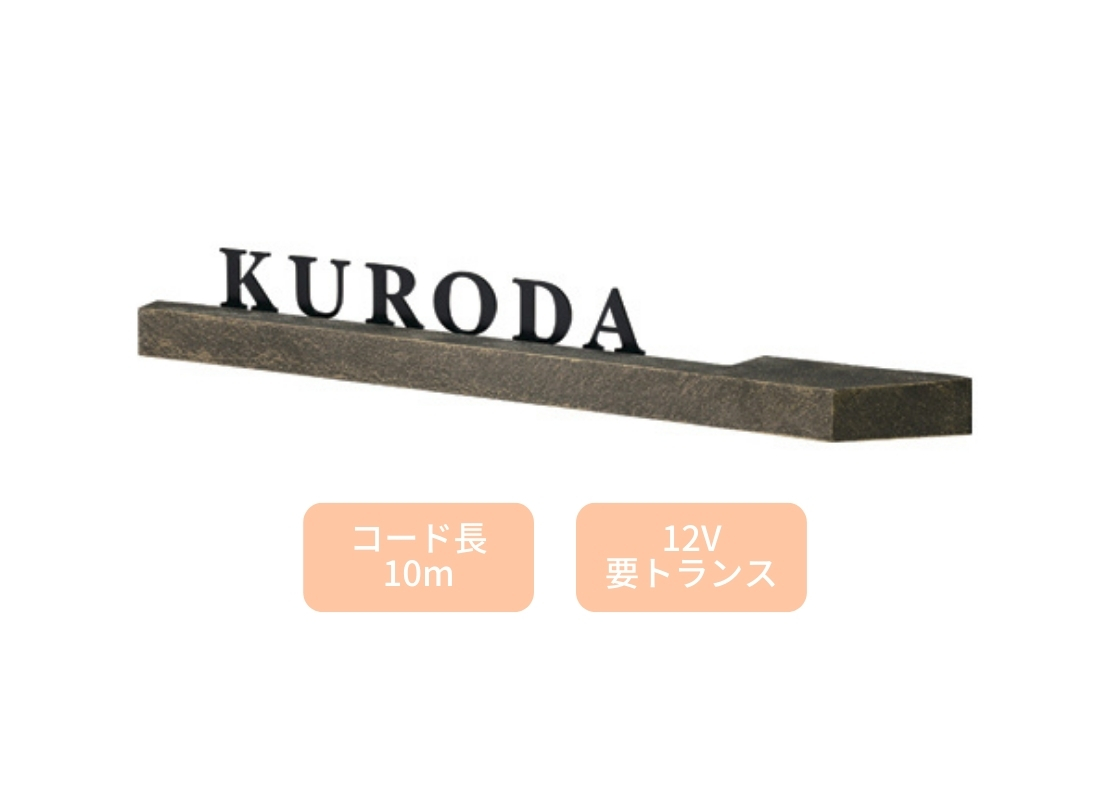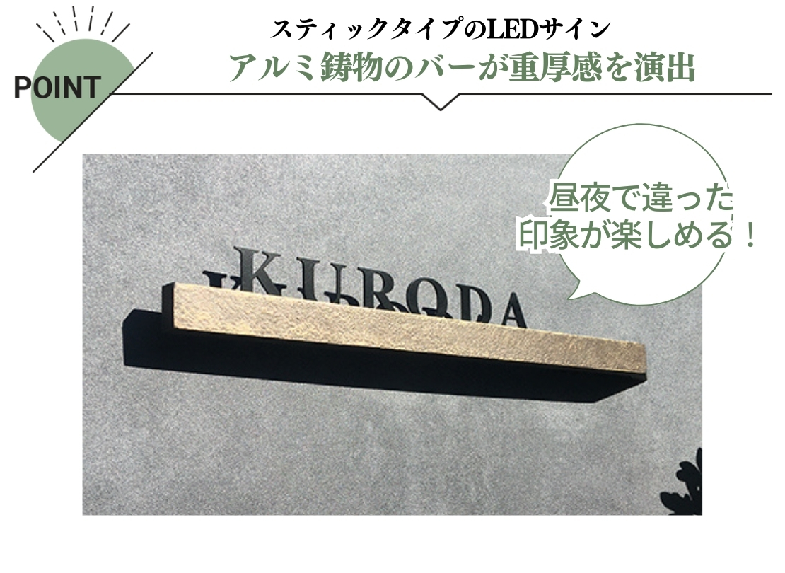 アルミ鋳物のバーと立体的な切文字を組み合わせた、存在感のあるLED表札です。昼間は素材感と影で表情をつくり、夜はバックライトが名前をやさしく浮かび上がらせてくれます。厚みのあるスティック形状なので、シンプルな外構でも埋もれにくく、門まわりのアクセントにちょうどいい一枚。「派手すぎず、でも印象に残したい」方におすすめです。