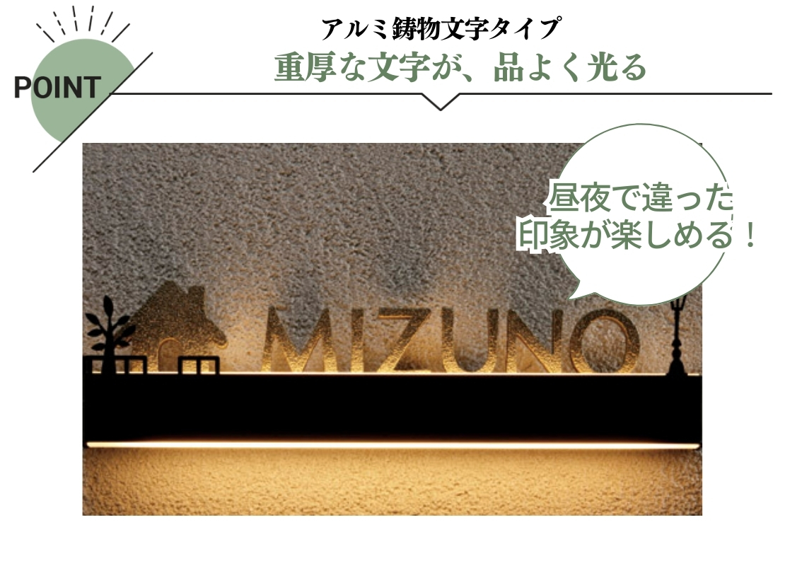 直線的で無駄のないフォルムに、文字を包み込むような間接照明がきれいに映えるLED表札です。アルミ鋳物文字の立体感と、電球色・ホワイトで印象が変わる光の表情は昼夜でしっかり差が出ます。取付方法や文字の「つなぎ」仕様など、事前に知っておきたいポイントが明確なのも安心材料。シンプル外構を上品に仕上げたい方におすすめです。