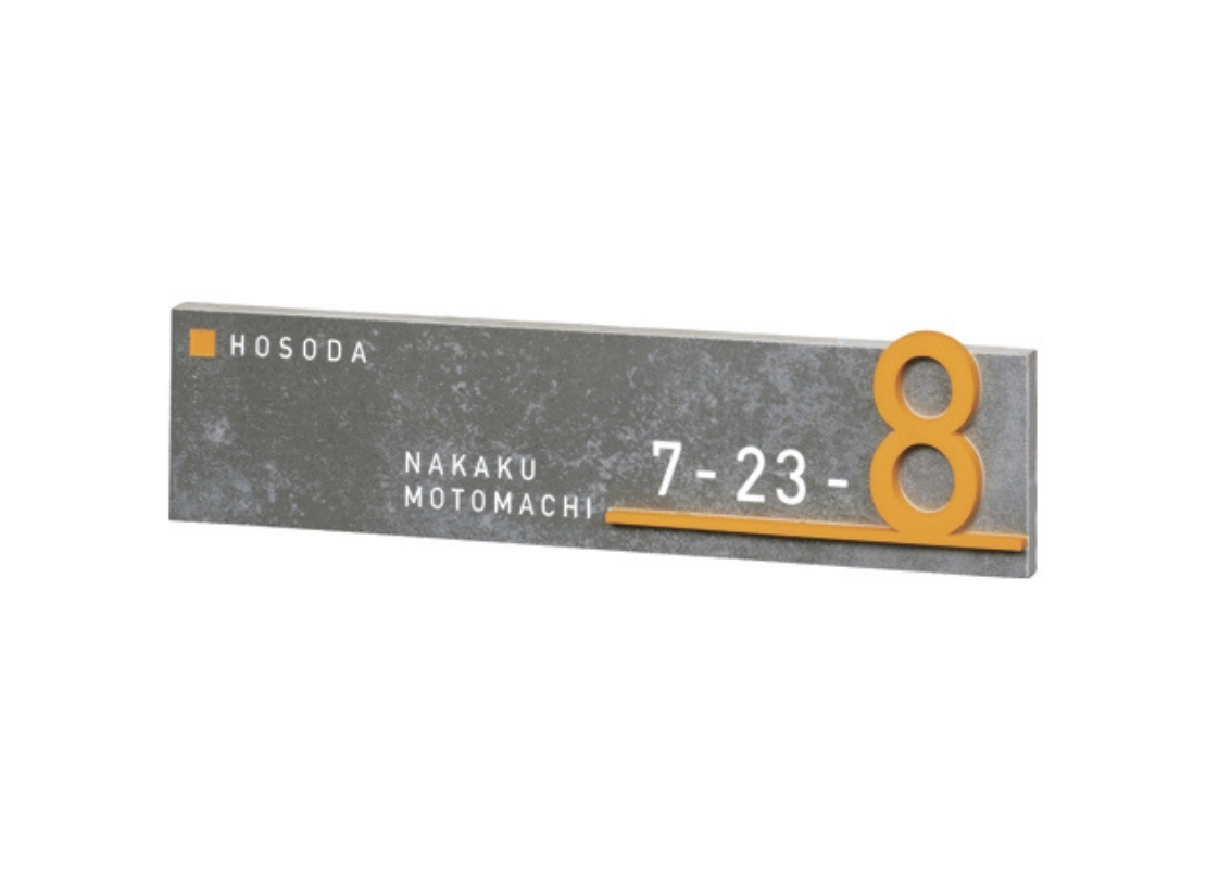 住所を主役にした、少し珍しいアドレスサインです。名前の掲示を控えたい方にも選ばれており、配達時の視認性もしっかり確保できます。モルタル調の落ち着いた質感に、アクセントナンバーの立体感が効いていて、シンプル外構との相性も抜群です。