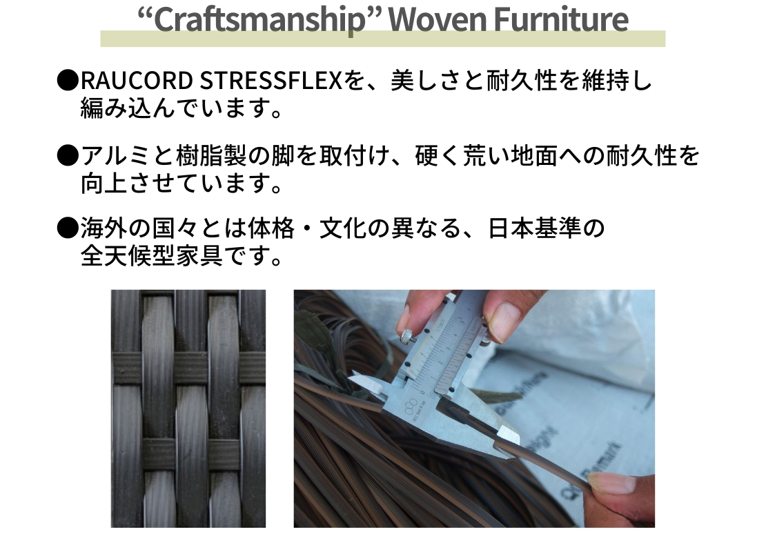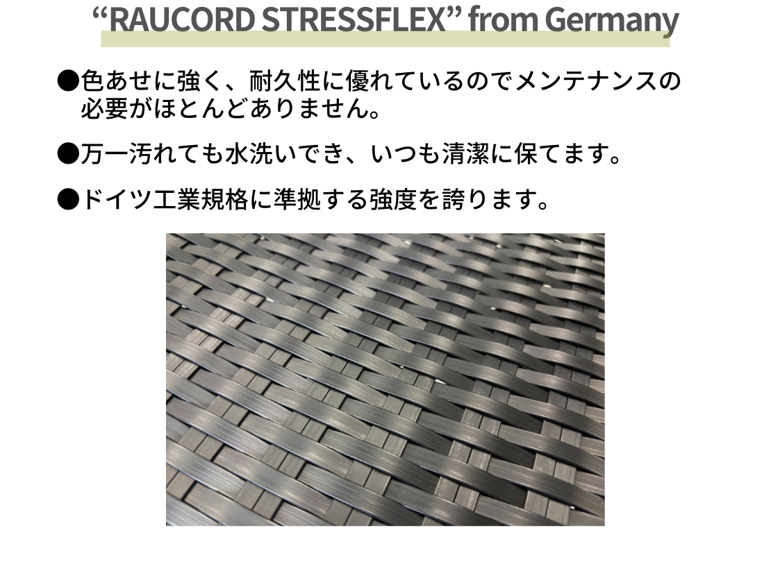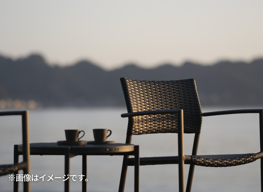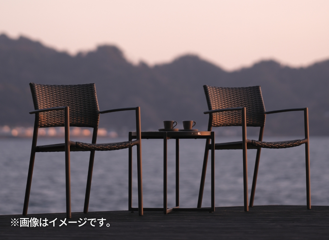 従来のラタン調とは異なり、フラット形状のラウコードを採用することで、カジュアルさを抑えたモダンな印象に仕上がっています。グレイブラックの落ち着いたカラーリングは、屋外に設置しても空間の雰囲気を崩さず、外構やテラスとの相性も良好。耐候性・メンテナンス性に優れ、さらにスタッキングも可能なため、デザイン性と実用性を両立した一脚です。