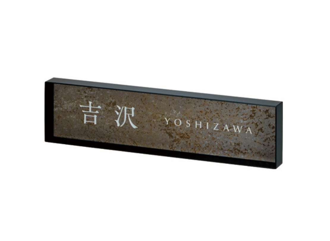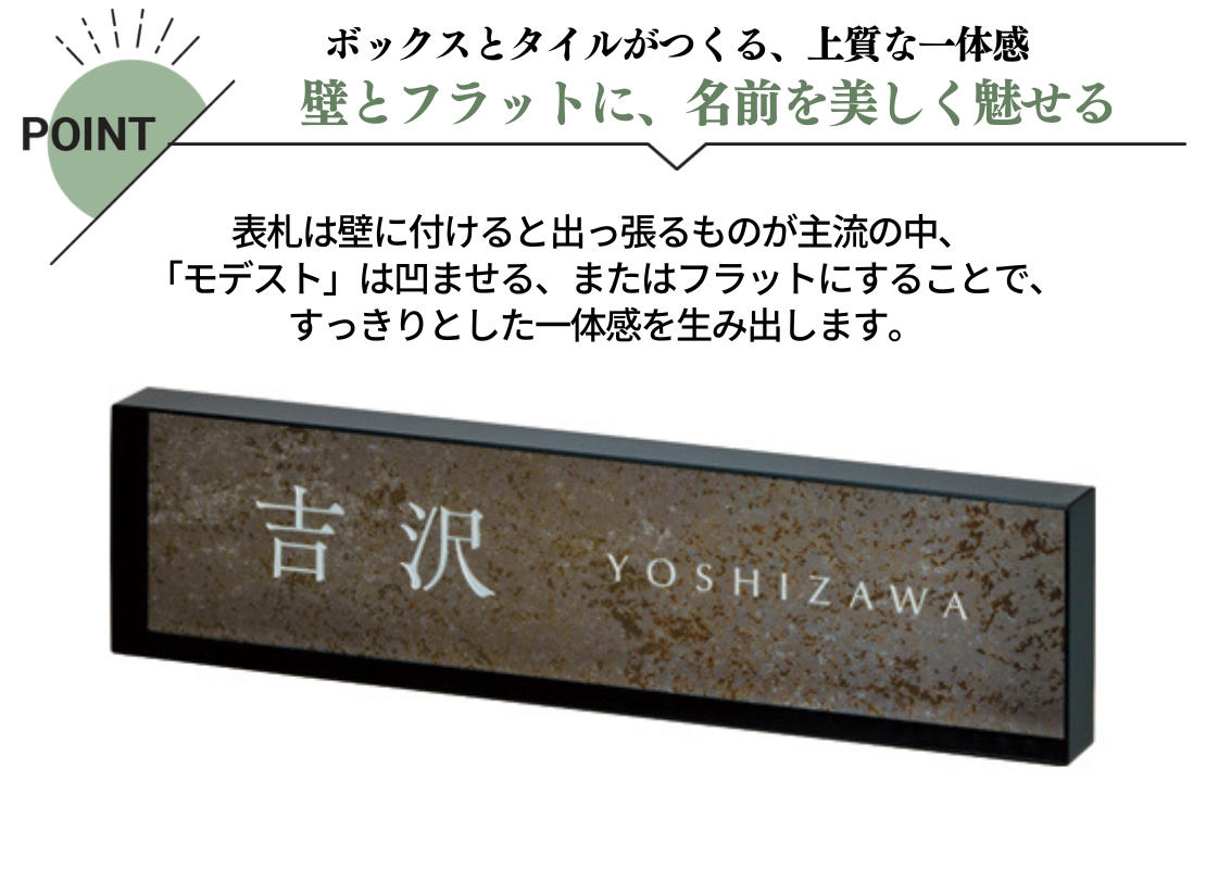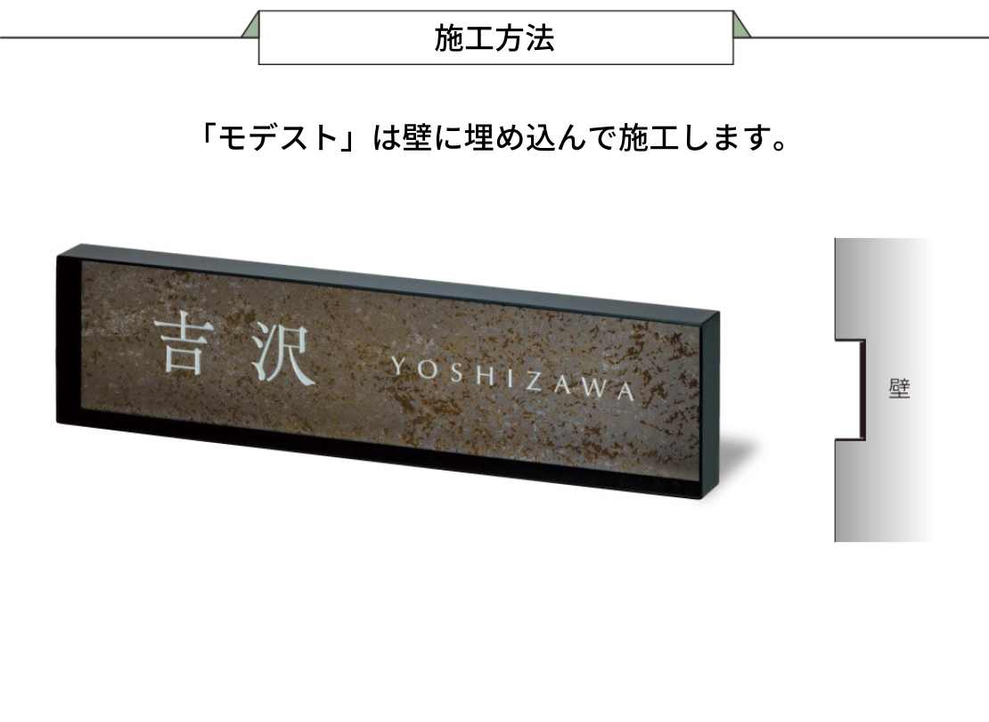 表札といえば壁に取り付けた時にでっぱっているものが主流。どんなに薄い表札でも壁に付けば凸の形になります。「モデスト」は奥に凹ませる、または壁とフラットに設置する事ですっきりスマートにネームを見せてくれる商品です。